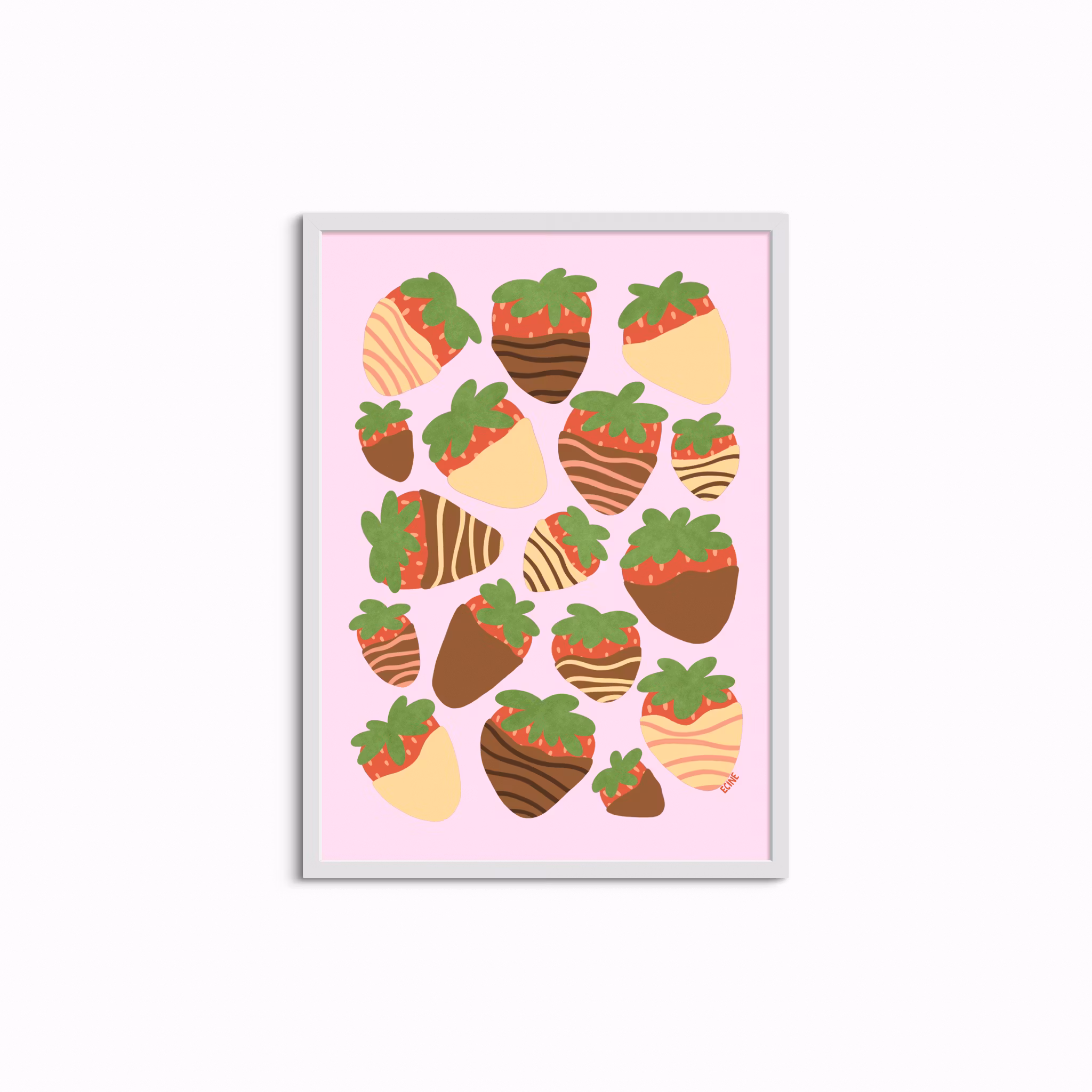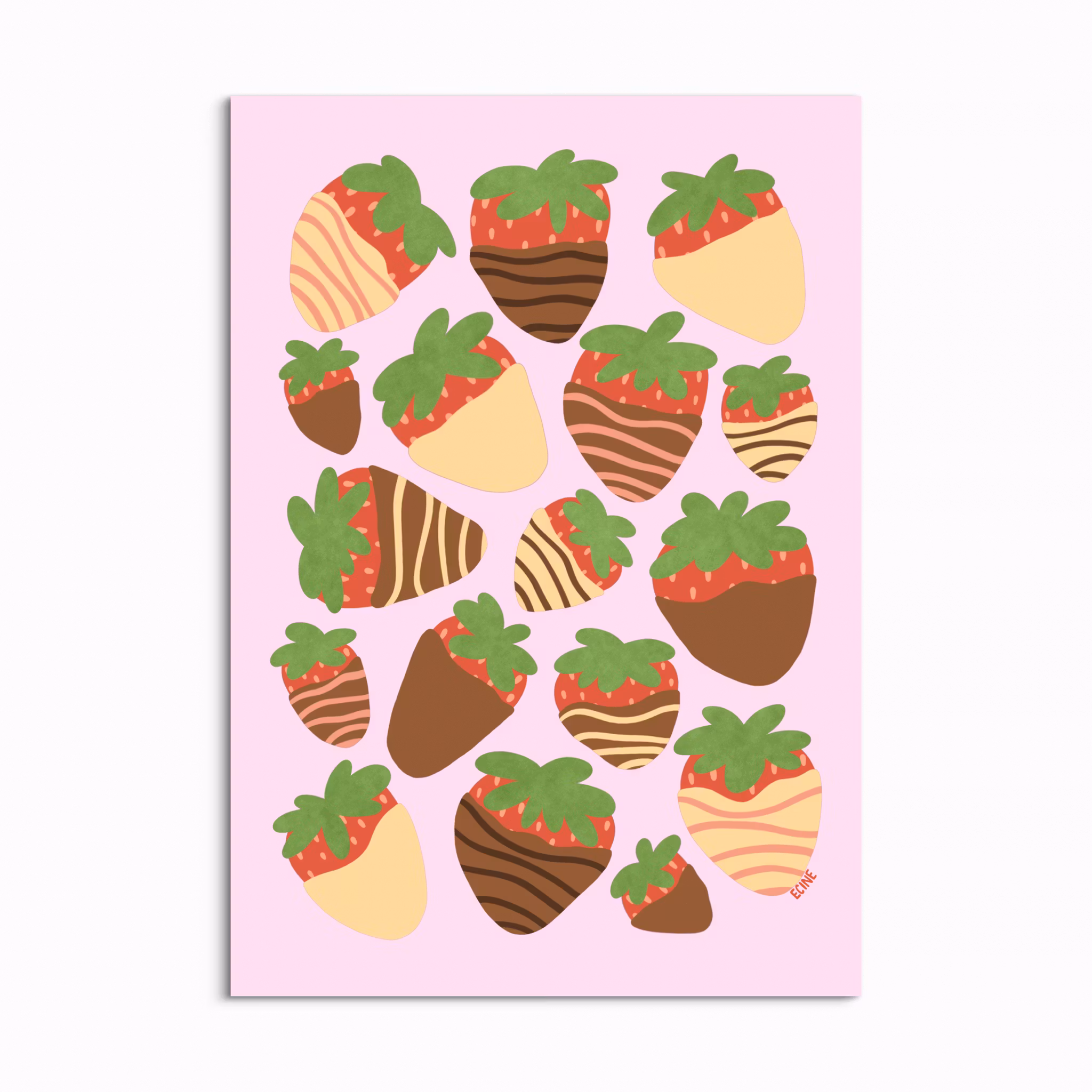 Jordgubbsfrossa är ett fine art print med motivet av jordgubbar doppade och dekorerade med choklad. Det finns med bakgrundsfärgerna vit, blå och rosa. Tryckt på 210 gsm högkvalitativt matt papper. Jordgubbsfrossa finns tillgänglig i storlekarna 30x40 cm samt 50x70 cm.